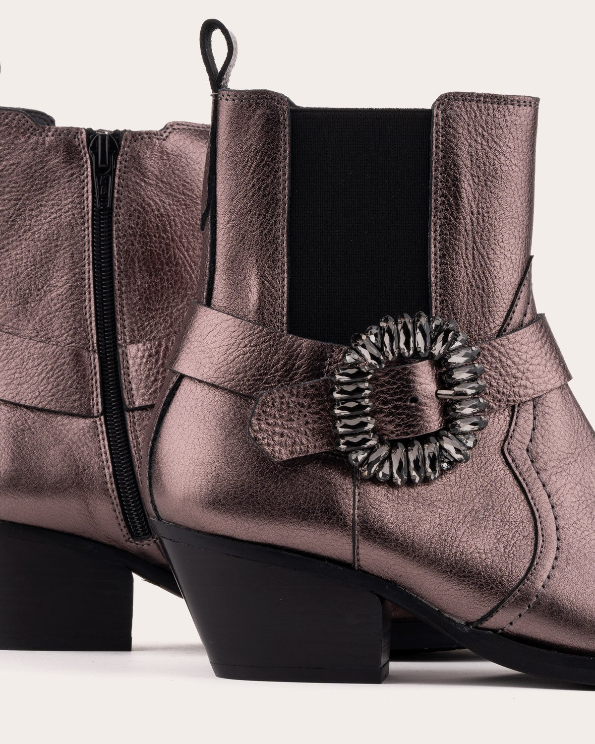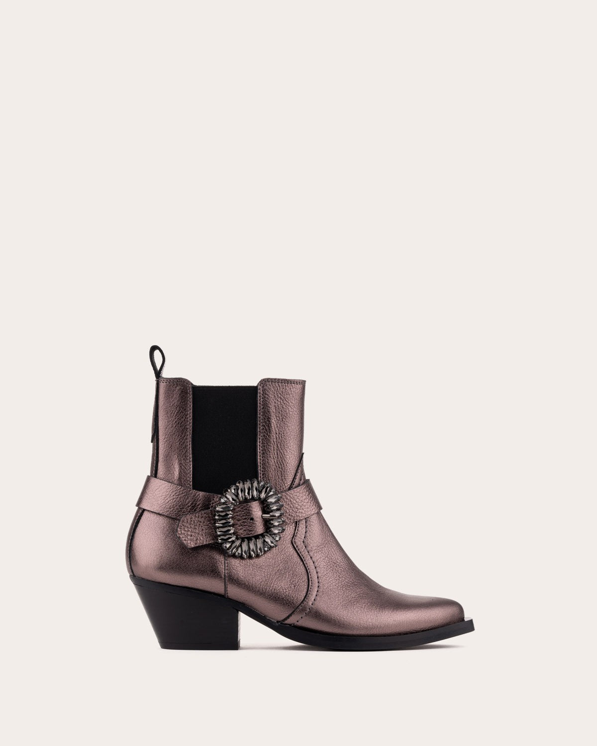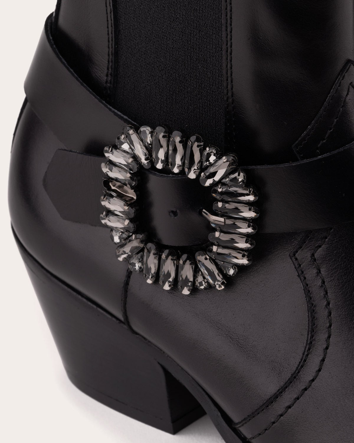 - Cowboy-style ankle boot made of leather. Designed with adjustable elastic side panels and a buckle adorned with small stones.