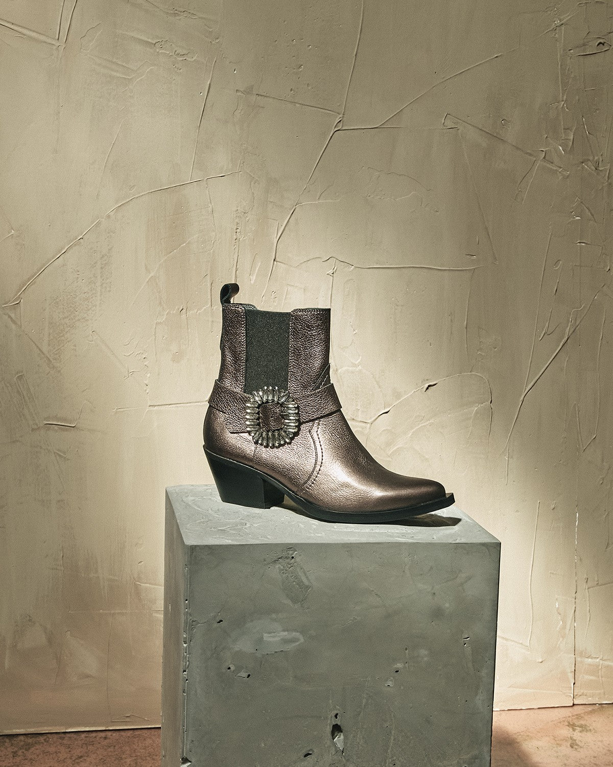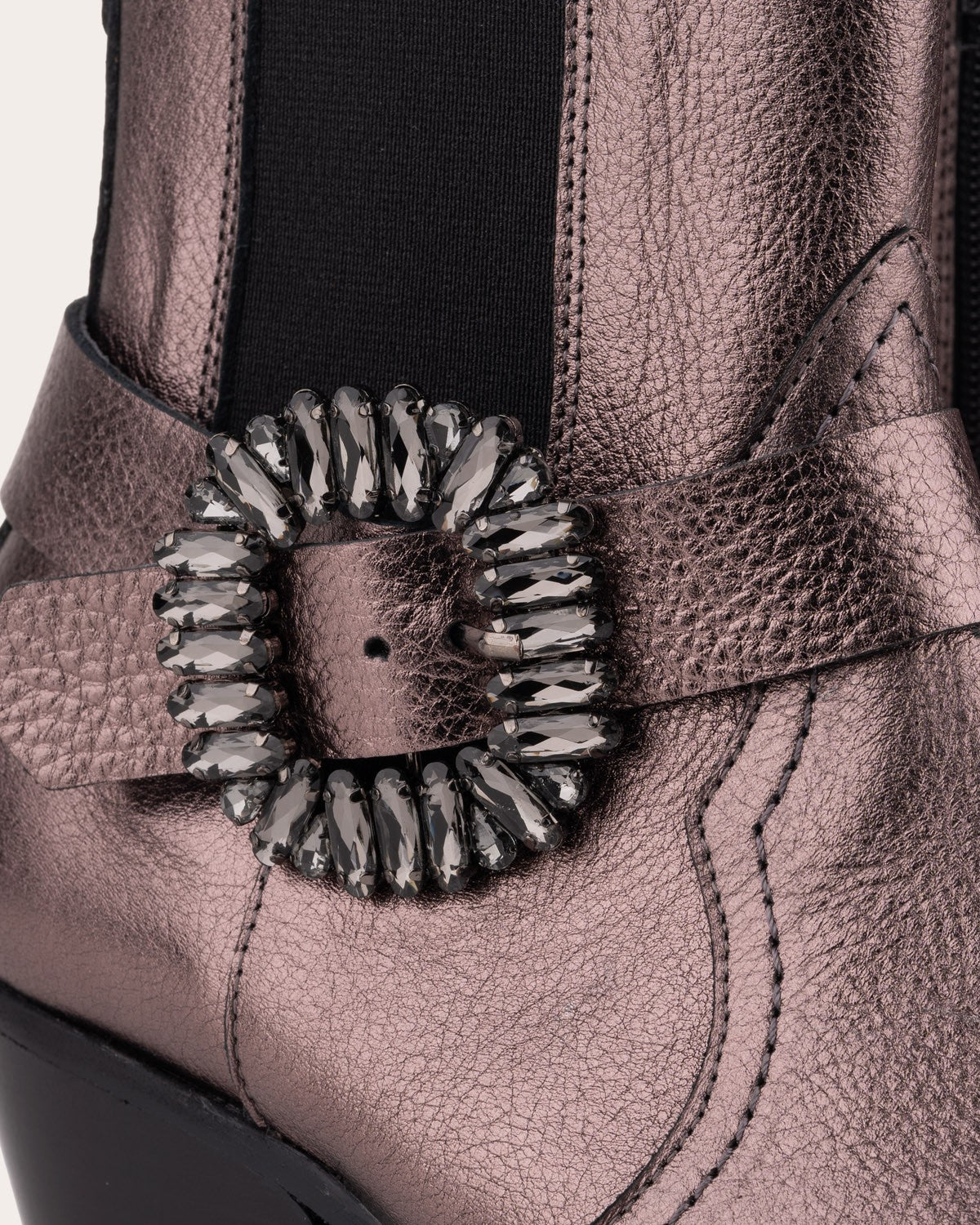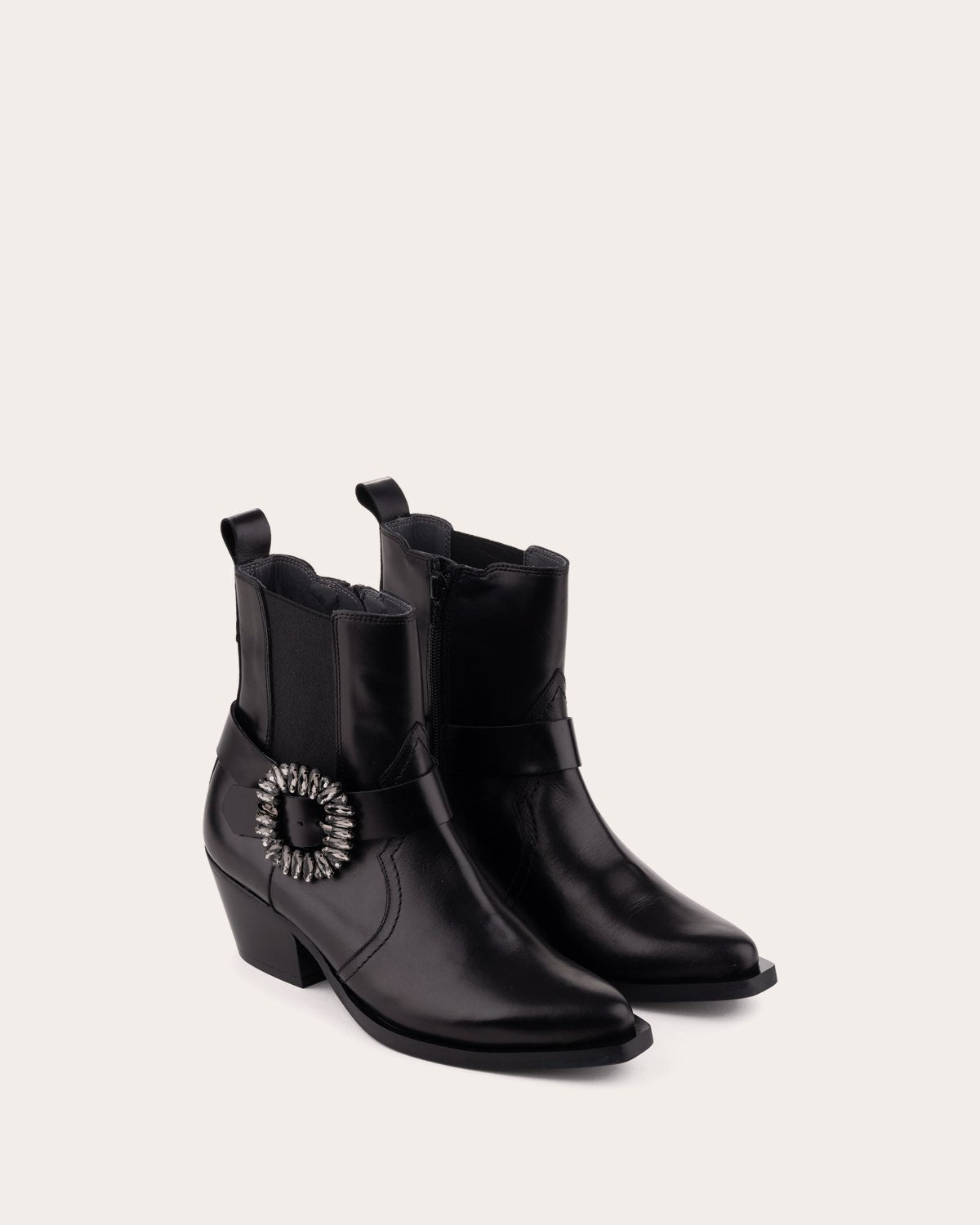 - Cowboy-style ankle boot made of leather. Designed with adjustable elastic side panels and a buckle adorned with small stones.