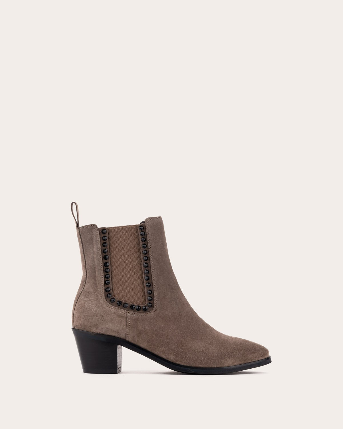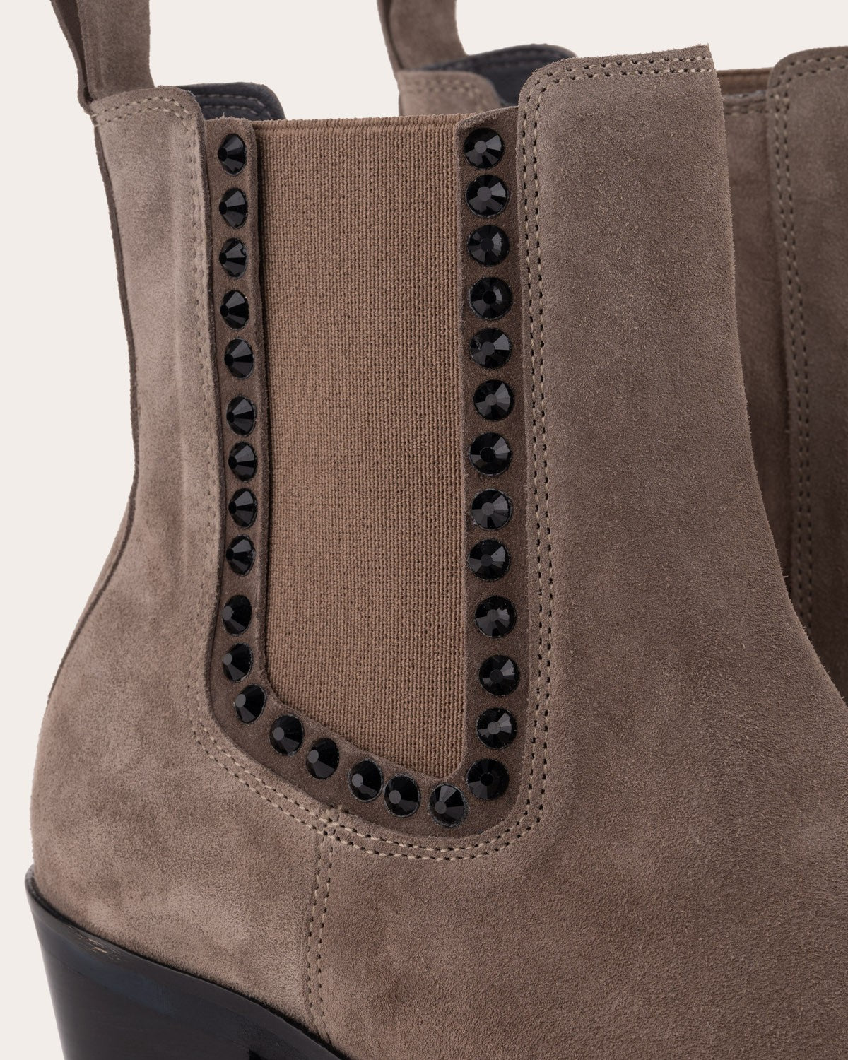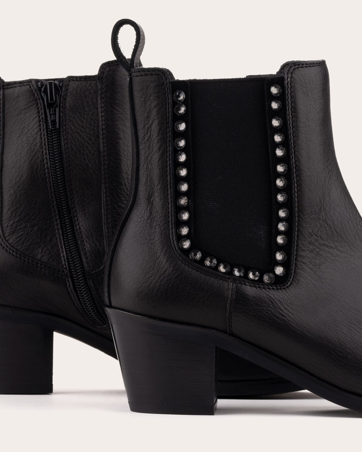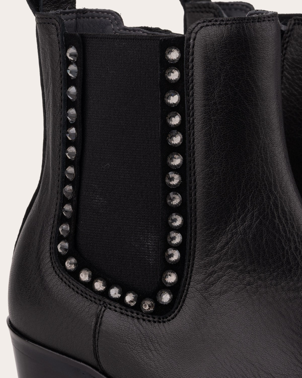 Leather ankle boots with a medium heel. Design with side elastics decorated with small stones.