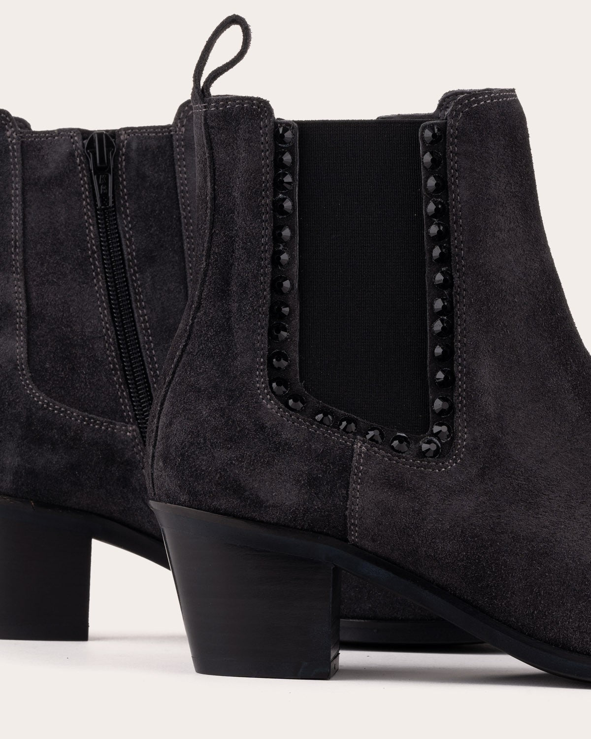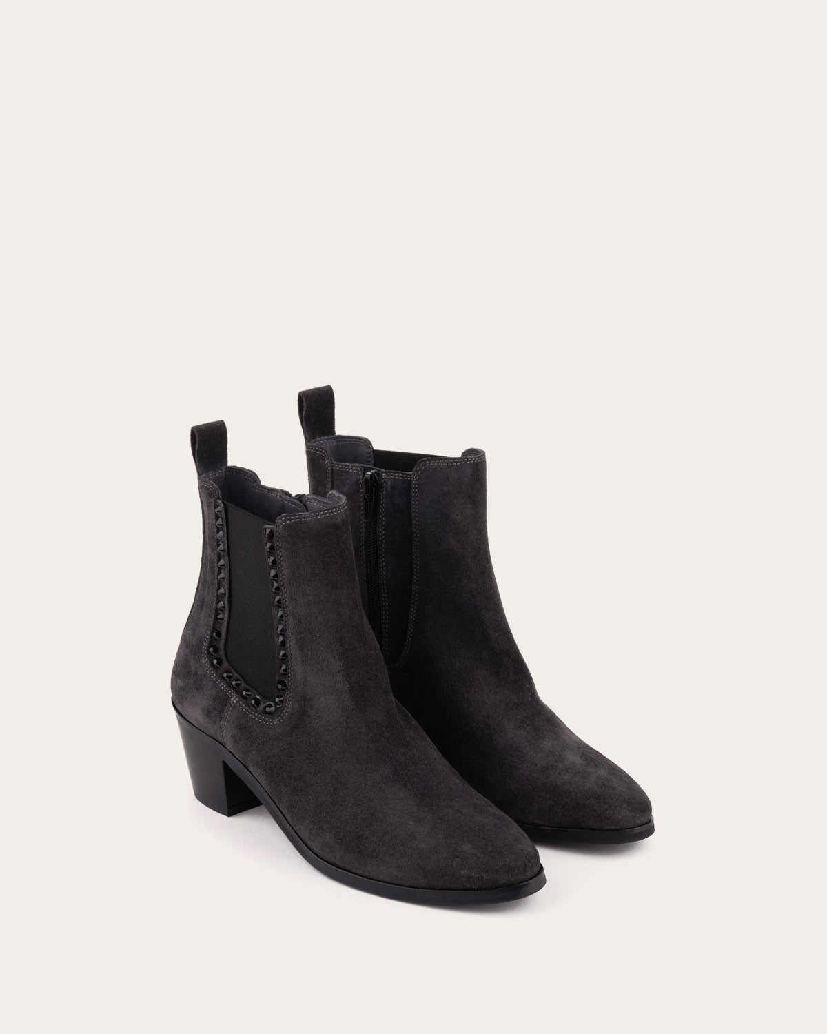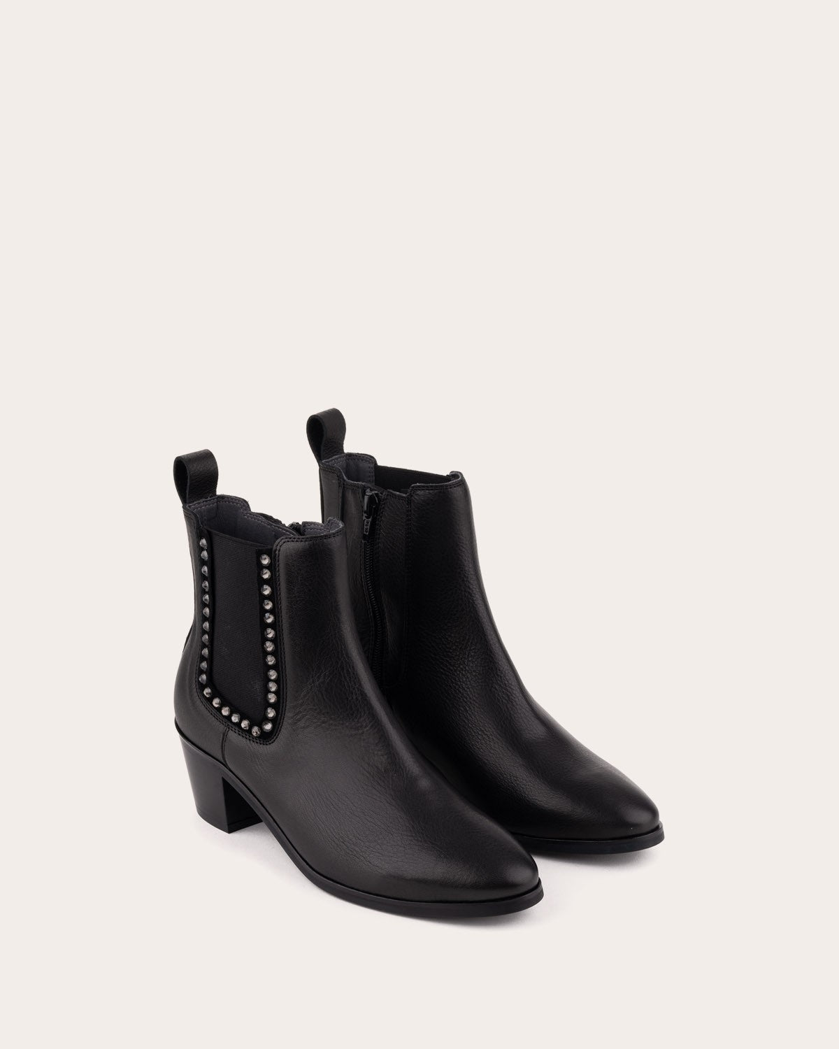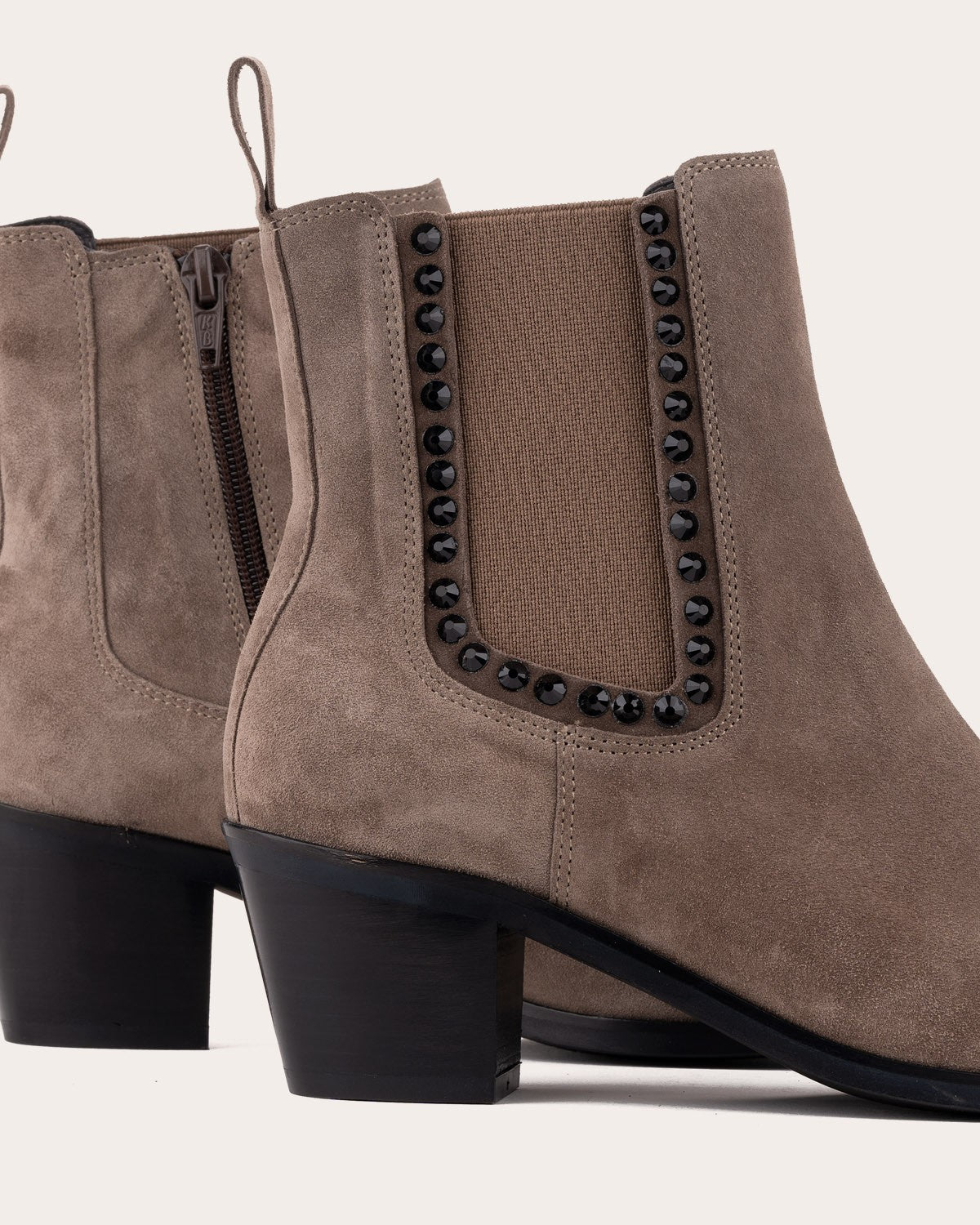 Leather ankle boots with a medium heel. Design with side elastics decorated with small stones.